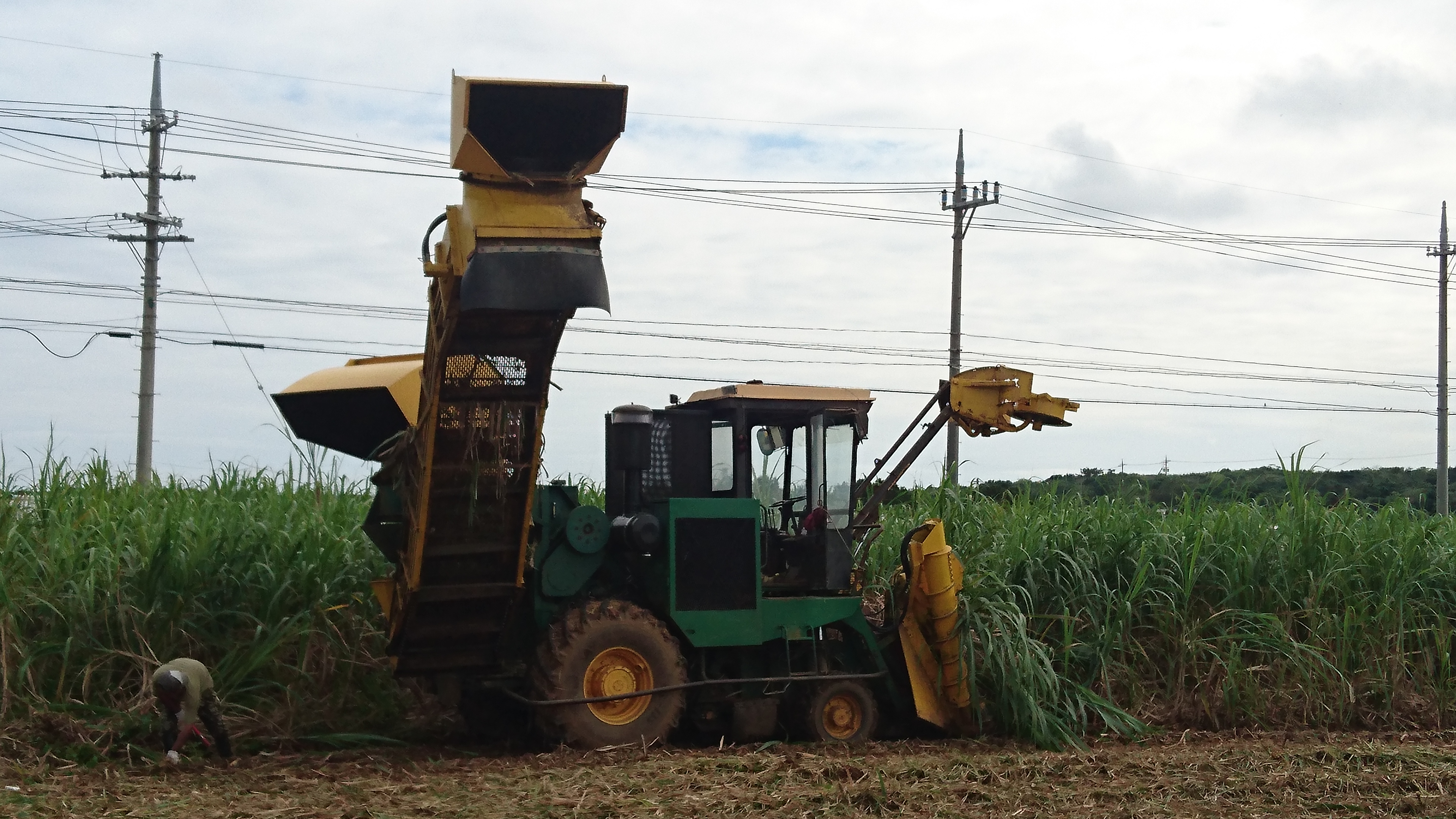 サトウキビの収穫期は冬場なんですよ。最近は大型機械のハーベスターで刈り取りをします。